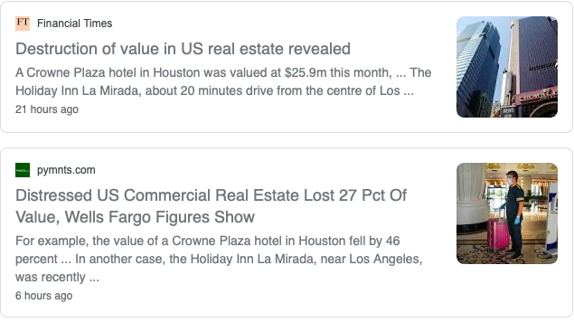 富国银行研究报告称,一旦商业地产所有者还不起贷款,其抵押的地产估值将会下降,平均贬值幅度高达27%。以估值为2590万美元的休斯顿一家皇冠假日酒店(Crowne Plaza hotel)为例,本月该酒店价值较2014年被捆绑进CMBS交易时下跌了46%。自3月份以来,该酒店就一直没有偿还抵押贷款,并在5月份被移交给特别服务机构。另一家距离洛杉矶市中心约20分钟车程的米拉达假日酒店(Holiday Inn La Mirada)最新估值为2210万美元,较2015年下跌了27%。此外,由于自4月以来没有还清抵押贷款,美国田纳西州哥伦比亚的一家假日酒店今年9月估值大跌37%至770万美元。