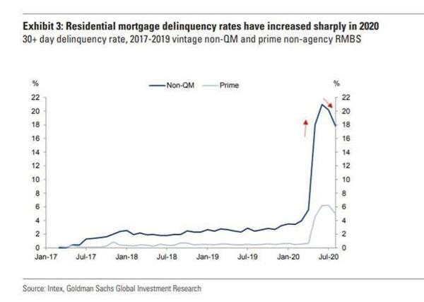 然而在新冠疫情期间,华尔街又重新向信用不佳的房主提供贷款。据高盛数据显示,与私人债券捆绑中、或没有政府支持的住宅抵押贷款的违约率已从1月份约4%的低点飙升至7月份的约18%。