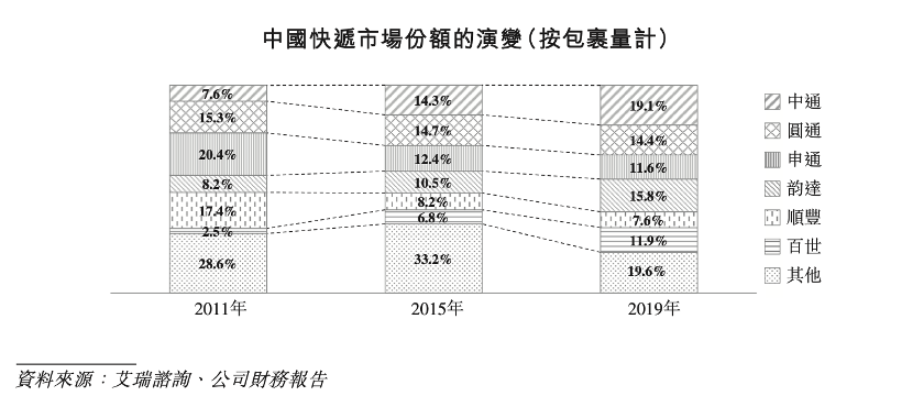 虽然目前中通快递市场份额领先同行,但中国的快递市场竞争不同于美国,并没有形成寡头垄断的局面,且同质化现象严重。