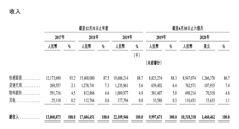 数据显示,2017年至2019年间,快递服务收入在中通快递总收入中占比一直居高不下,分别为93.2%、87.5%、88.7%,今年上半年,这一比例仍高达86.7%。