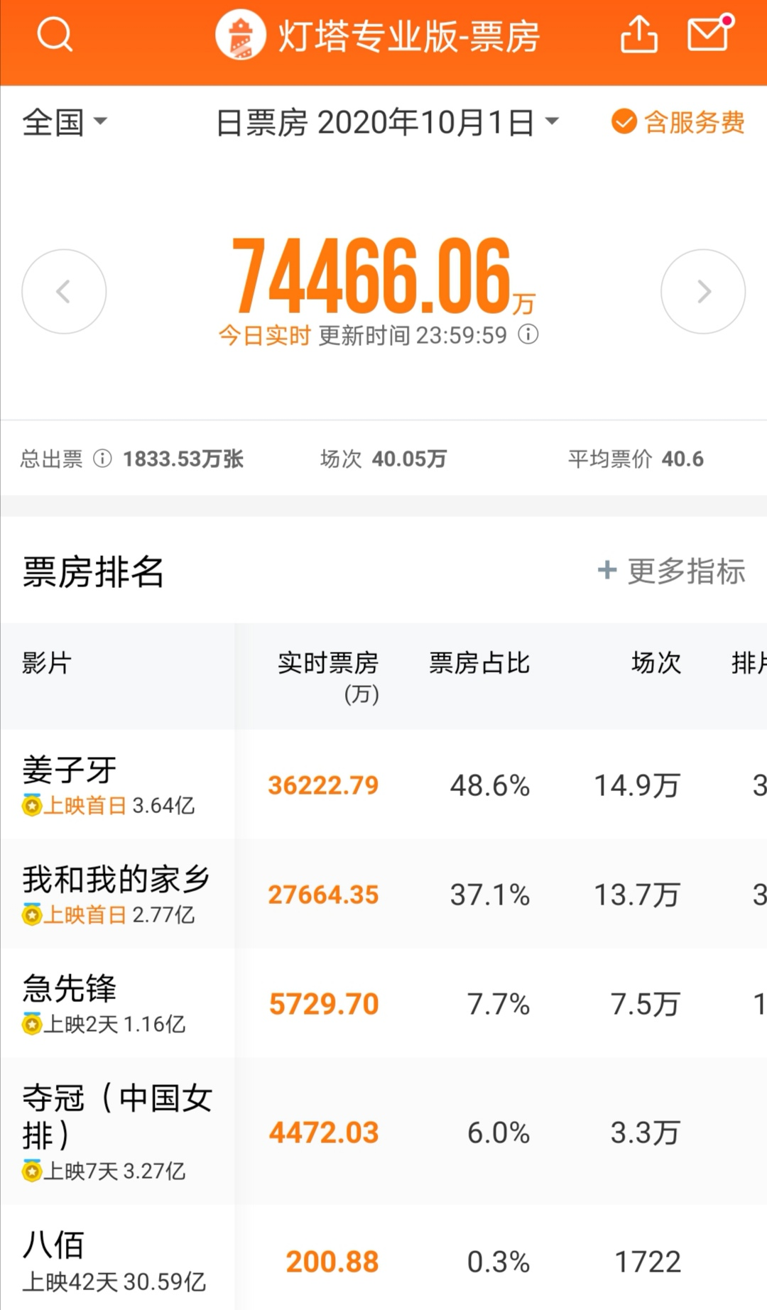 截至11点59分59秒,据灯塔专业版显示,国庆档首日票房已经达到7.4亿。其中,《姜子牙》单日票房排名第一,票房突破3.6亿,同时大幅刷新动画电影首日票房纪录,《我和我的家乡》紧随其后,单日票房2.7亿,热门电影《急先锋》《夺冠》累计票房均已过亿。