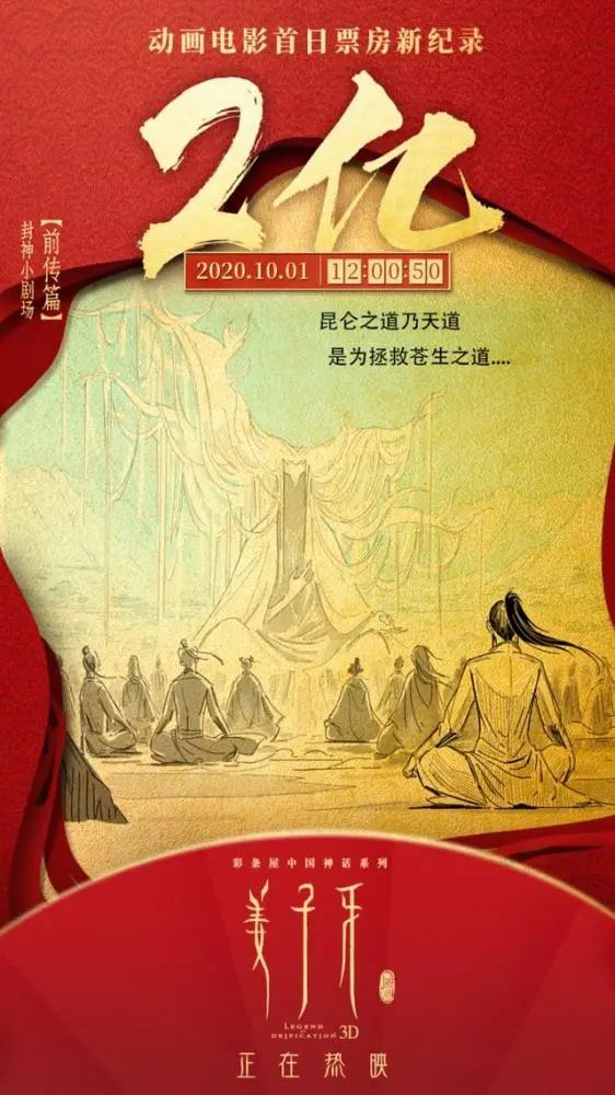上映首日,截止中午12点,《姜子牙》的票房就已经高达2亿元,领跑国庆档。此前,该片在票房迈过1.44亿时已刷新由《哪吒之魔童降世》保持的中国影市动画电影首日票房纪录。