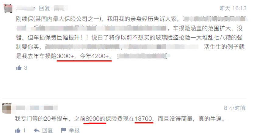 还有人在社交网络上抱怨,自己的车损险被捆绑了一堆过去没有选的保障,导致保费上涨。