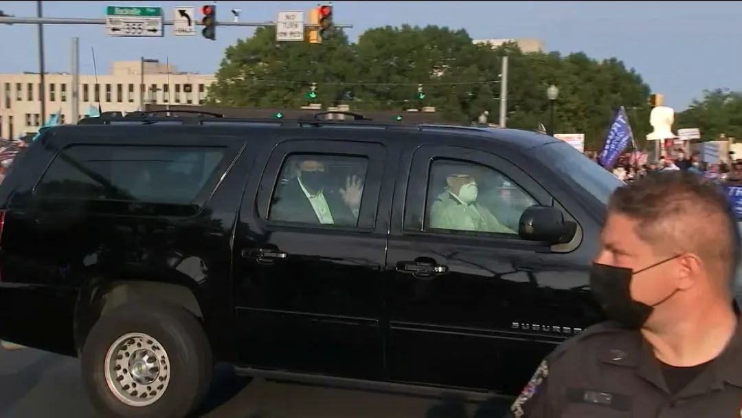 特朗普乘专车向医院外的支持者挥手致意。图源CNN