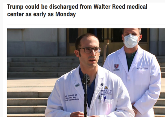医疗队成员布莱恩·加里波迪(Brian Garibaldi)医生表示,总统最早可能当地时间周一(5日)出院。加里波迪称,总统在3日完成第二剂瑞德西韦治疗后,“今天他感觉很好。”“他一直在四处走动。我们今天的计划是让他吃饭喝水和起床。“如果他继续保持今天的状态和感觉,他最早明天就可以出院返回白宫,在白宫继续他的治疗。”