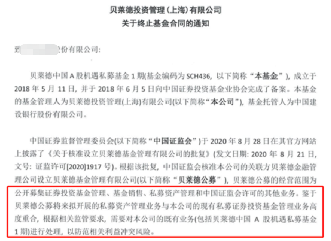 但最近,基金君从业内获悉,最近,贝莱德投资发布《关于终止基金合同的通知》,涉及“贝莱德中国A股机遇私募基金1期”拟清算。贝莱德投资表示,根据中国证监会8月28日披露的批复文件,证监会核准本公司的关联方贝莱德金融管理公司设立贝莱德基金管理有限公司(简称贝莱德公募)。鉴于贝莱德公募将来拟开展的私募资产管理业务与本公司的现有私募证券投资基金管理业务高度重合,根据相关监管要求,需要对本公司的既有业务进行处理,以防范相关利益冲突风险。
