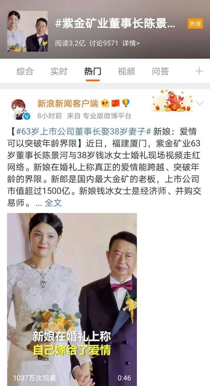 周三,中国最大的黄金企业紫金矿业(601899.SH;02899.HK)董事长陈景河大婚的照片和视频网上广为传播,并上热搜。由于两人的年龄差距不小,这也成为网民热议的焦点。