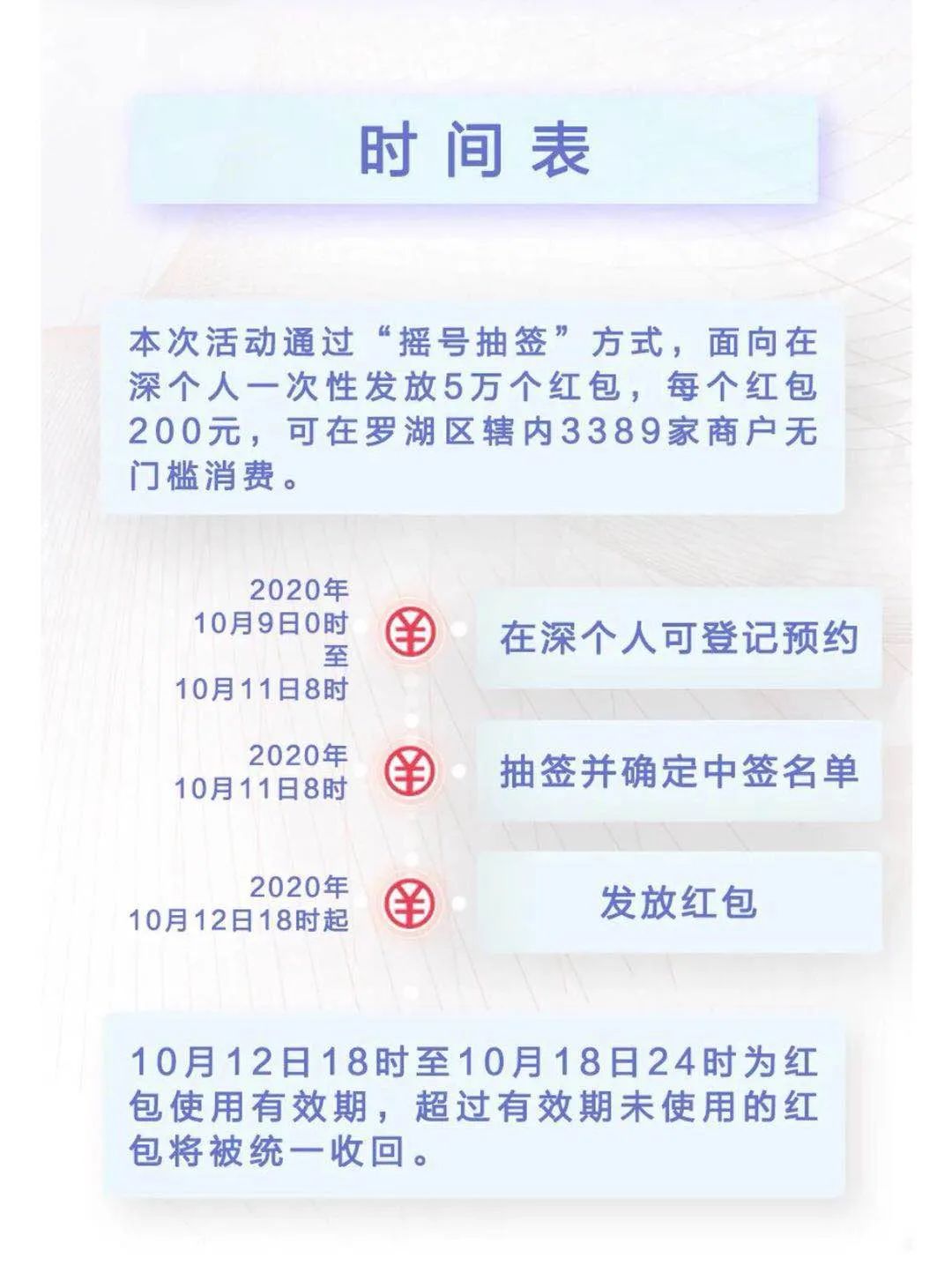 据了解,此次活动是向在深个人发放1000万元数字人民币红包,每个红包金额200元,数量共计5万个。该红包可于10月12日18时至10月18日24时在深圳市罗湖区辖内已完成数字人民币系统改造的3389家商户无门槛消费。