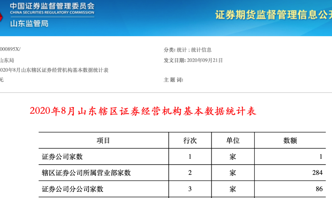 2013年9月,中信证券完成全资收购万通证券(原青岛证券),并将其更名为中信证券(山东),山东境内证券公司再少一家。山东证监局数据显示,截至8月,山东辖区仅有中泰证券一家证券公司。