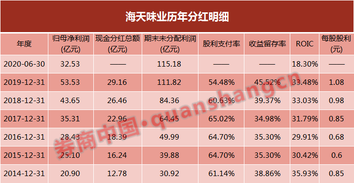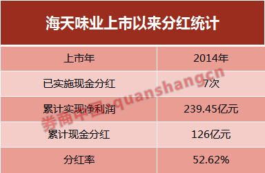 海天味业的自由现金流强劲,保持着良好的分红记录。统计数据显示,海天味业自2014年上市以来,共分红7次,累计分红126亿元,占到其累计实现净利润的52.62%。公司仅在首发募资时融资19.2亿元,累计分红是首发募资的6.6倍。