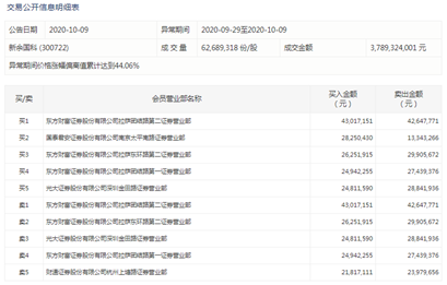 10月9日晚间,深交所发布的信息显示,在9月29日至10月9日期间,新余国科涨幅偏离值累计达到44.06%,成交金额达37.89亿元。其中,游资现身龙虎榜。东方财富证券股份有限公司拉萨团结路第二证券营业部买入4301.72万元,卖出4264.78万元;东方财富证券股份有限公司拉萨东环路第二证券营业部买入2625.19万元,卖出2990.57万元。