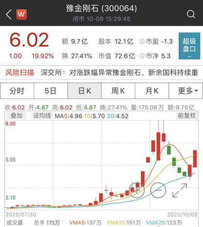 从8月下旬开始,豫金刚石股价持续拉升,到了9月下旬时已达到最高8元每股的价格,而近期在连续下跌之后再度出现反弹拉升,10月9日收盘前再度出现了涨停。10月9日晚间,豫金刚石再次发布公告提醒投资者注意风险。