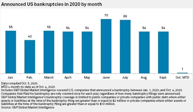 标普上述的破产分析主要包括有公共债务的上市公司或私营公司,在申请破产时,被列入公共债务公司名单的上市公司的资产或负债必须至少为200万美元。相比之下,私营公司必须至少包括1000万美元。