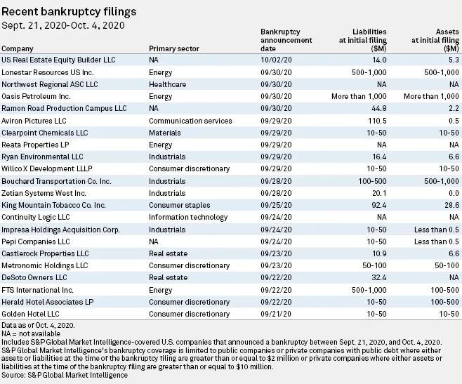 9月21日至10月4日之间,依然有能源、消费等行业的大量美国企业申请破产,其中不乏资产超过5亿美金的大型能源公司(如Lonestar Resources 和 Oasis)。