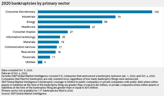 据标普统计,今年以来(截至10月5日),消费行业的大型破产企业数量最多,达103家,占比超过总数的20%。