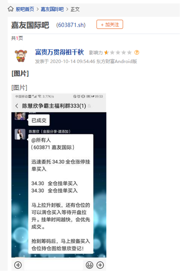 有网友贴出的微信截图显示,在一个名为“陈慧欣争霸主福利群”中,有人叫群中所有人“迅速委托”、“34.30 全仓挂单买入”,并称“抢到筹码后,马上报备买入仓位持仓图给慧欣登记!”