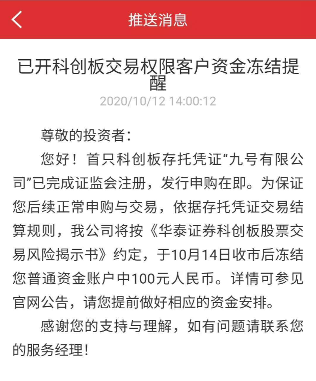 券商中国记者了解到,华泰证券计划在10月14日收市后冻结已开通科创板交易权限客户的普通资金账户100元人民币。称主要因为科创板首单CDR项目九号智能即将发行申购,依据的是存托凭证交易结算规则。该通知在12日发出。
