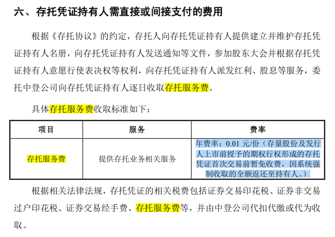 “存托服务费”为何物?根据九号智能招股书显示,存托人会向存托凭证持有人发送通知等文件,参加股东大会并根据存托凭证持有人意愿行使表决权等权利,还会提供派发红利、股息等服务。存托人会委托中登公司向存托凭证持有人逐日收取存托服务费。存托服务费的年费率为0.01元/份。