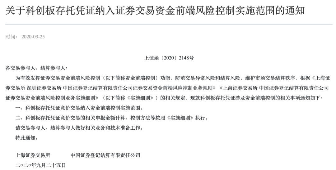 就在9月25日,为备战CDR项目即将发行,防范交易异常风险和结算风险,中国结算和上交所向交易参与人和结算参与人发布通知,要将科创板存托凭证竞价交易纳入资金前端控制实施范围;科创板存托凭证竞价交易的相关申报金额计算、控制方法等按照《实施细则》执行。