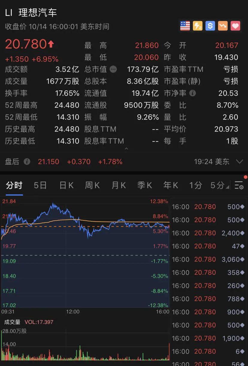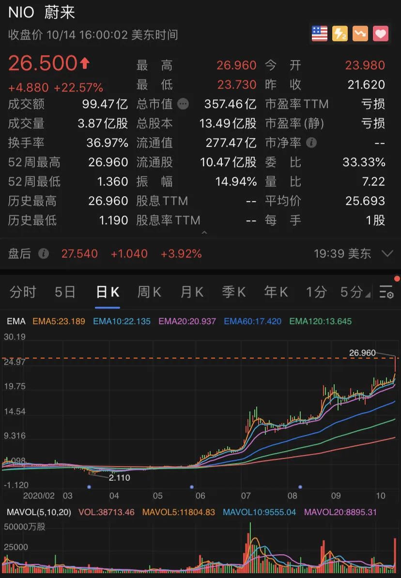 去年10月至今一年的时间里,蔚来股价从1.19美金涨到了26.5美金,涨幅超过21倍。