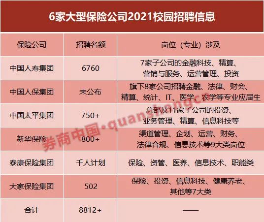 据券商中国记者梳理,目前,中国人寿集团、中国人保集团、中国太平集团、新华保险、泰康保险集团、大家保险集团已发布2021年校园招聘信息,招聘名额超过8800个。岗位遍及这些保险巨头的各个业务板块,经济、金融、保险、投资、金融科技、法律、财务乃至医学、农学等相关专业,都在招聘范围内。
