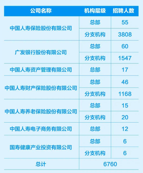其中,其核心子公司中国人寿保险股份有限公司(601628.SH,02628.HK)计划招聘人数超过3863人,其中总部55人,分支机构3808人;广发银行总部招聘60人、分支机构1547人;国寿资产总部招聘17人;国寿财险总部招聘46人,分支机构1168人;国寿养老总部招聘15人,分支机构20人;国寿电商总部招聘12人;国寿健康产业投资公司总部招聘6人,分支机构招聘6人。
