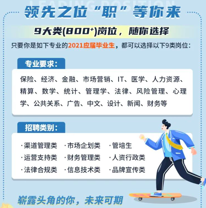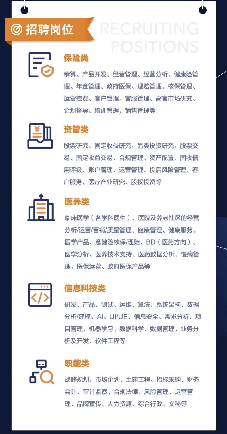 招聘范围包括但不限于经济、金融、保险、管理、法律、财会、精算、统计、营销、IT、医学、农学等几十个专业在内的国内外高校应届毕业生。