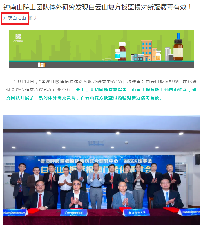 据白云山官微,以及广州日报等多家媒体报道,10月13日,“粤澳呼吸道病原体新药联合研究中心”第四次理事会白云山板蓝根澳门转化研讨会暨合作签约仪式在广州举行。会上,共和国勋章获得者、中国工程院院士钟南山透露,研究团队开展了一系列体外研究发现,白云山复方板蓝根颗粒对新冠病毒有效。