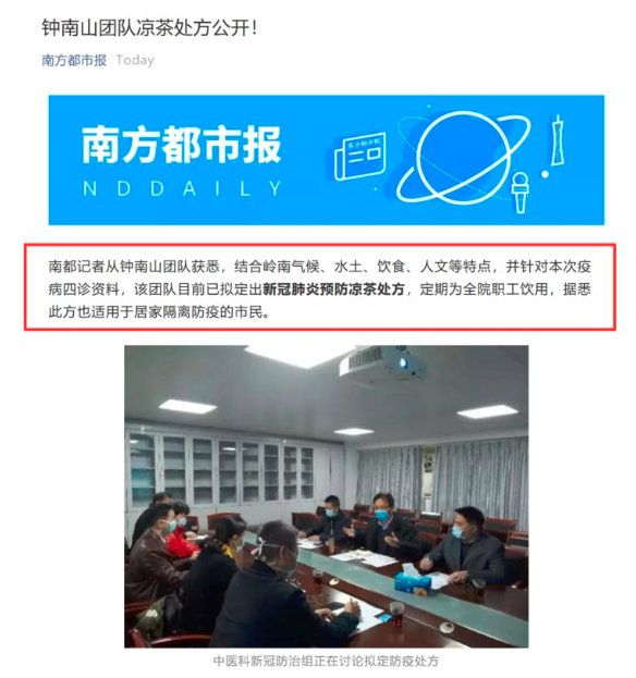 该报道还称,该预防凉茶处方经一线医护人员服用后,身体状况一致反应良好,得到了不少医护人员的青睐。