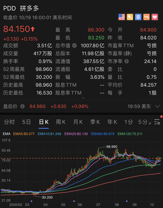 今年6月,拼多多的股价一度涨超80美金,比3月低点涨超164%,黄峥的审计随之水涨船高。