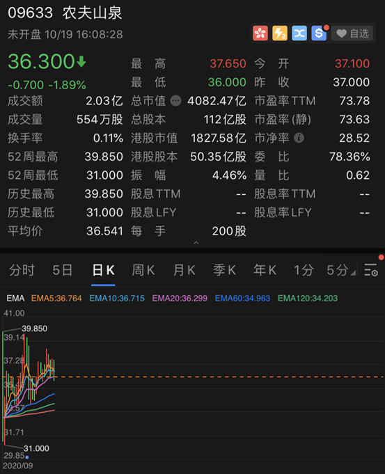 目前,农夫山泉市值超4000亿港元,是目前市值最大的中国饮料公司。