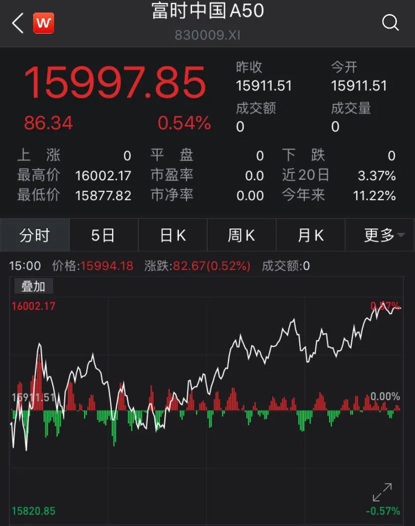 富时中国A50指数期货涨0.54%。