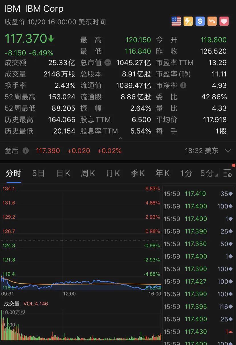 老牌科技股IBM却因发布季报而大跌6.5%,市值蒸发近500亿。