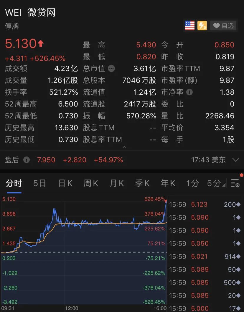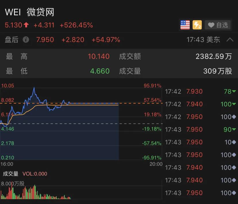 昨夜,中概股微贷网大涨526%,盘后继续上扬,一度涨超90%。