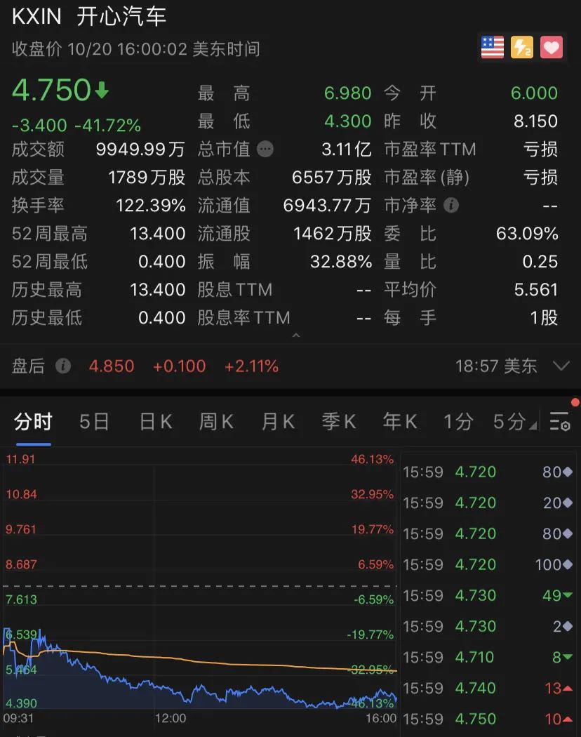 周一暴涨近300%的开心汽车,在周二暴跌超40%。