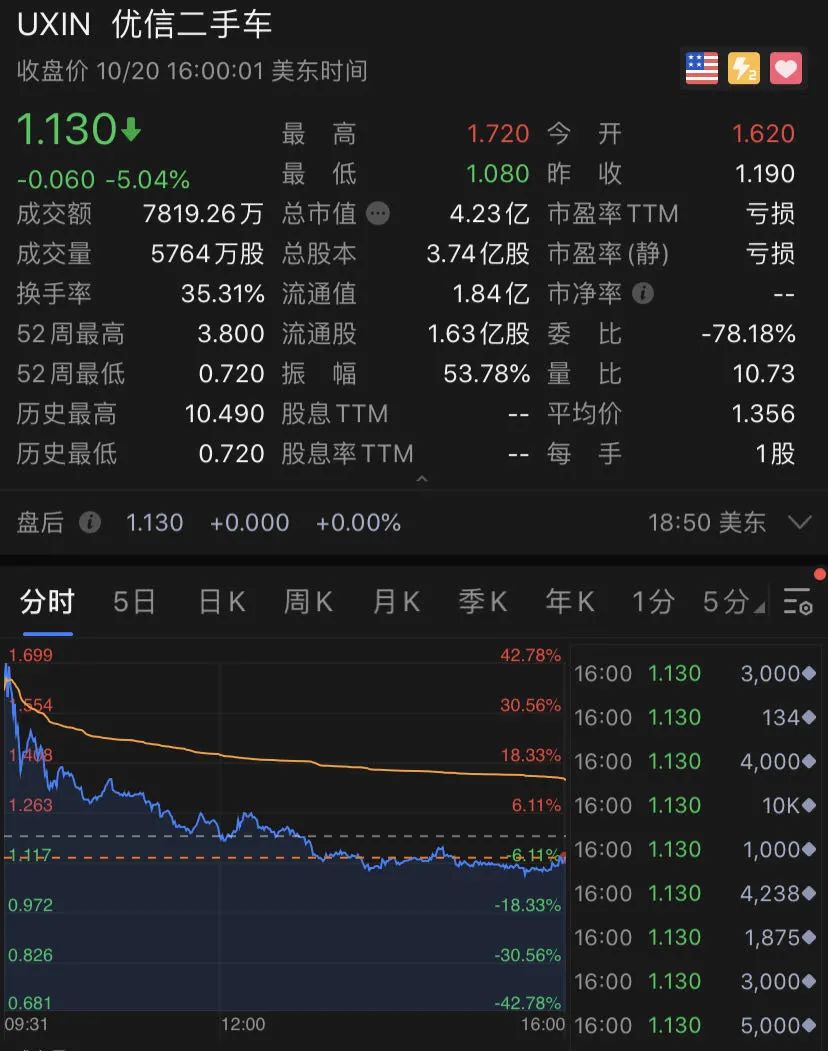 优信二手车开盘一度大涨超40%,公司获新加坡主权财富基金GIC增持至11.41%。但其股价迅速回落,盘中巨震,振幅超50%,收跌5.04%。