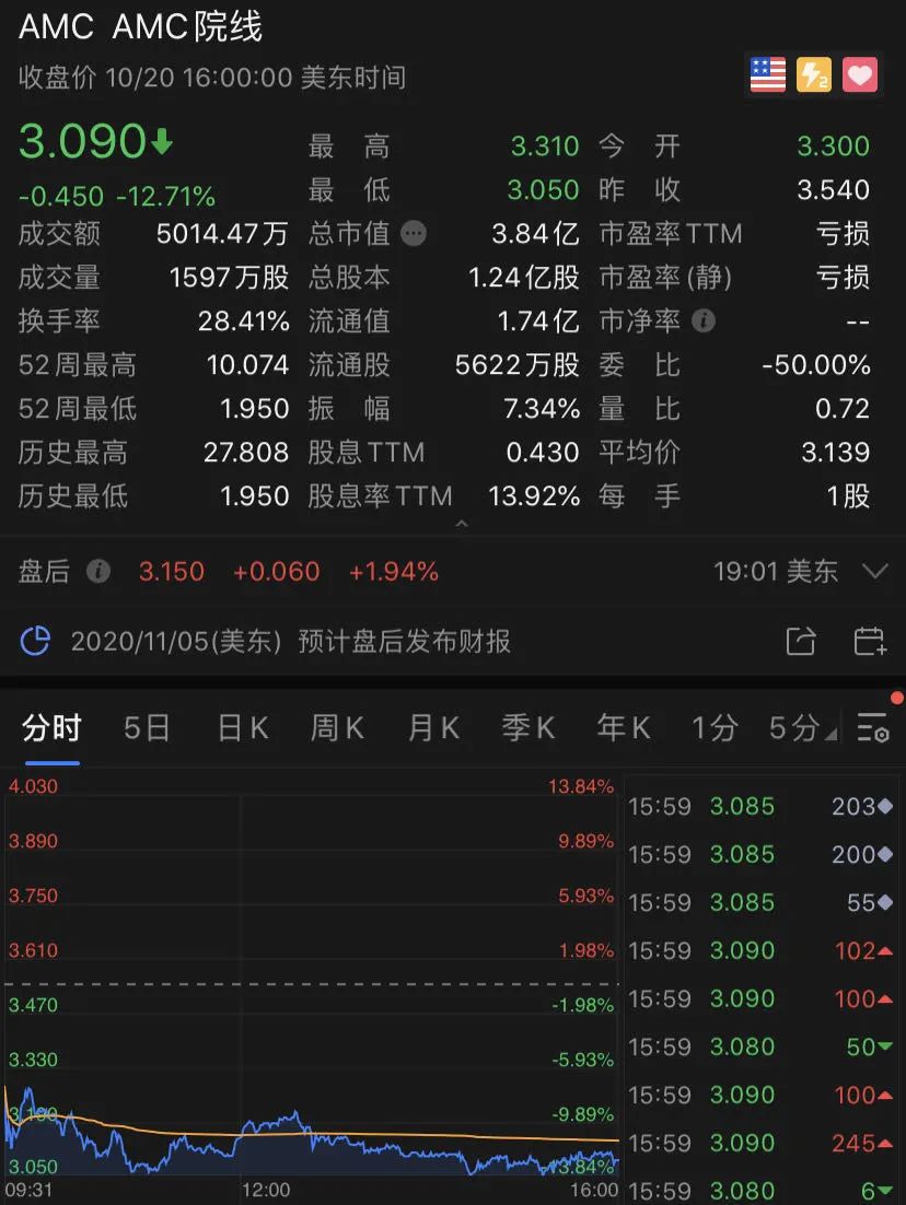 当地时间周二,AMC院线宣布将出售最多1500万公司A类股以筹措流动资金,并警告投资者称现有资金可能在年底或明年年初耗尽,如果届时无法补充流动性将不得不申请破产保护。同时公司周二也公布了三季度业绩预告,其中营收1.19亿美元仅为去年同期13.2亿美元的不足十分之一。截至周二收盘,AMC院线大跌12.71%。