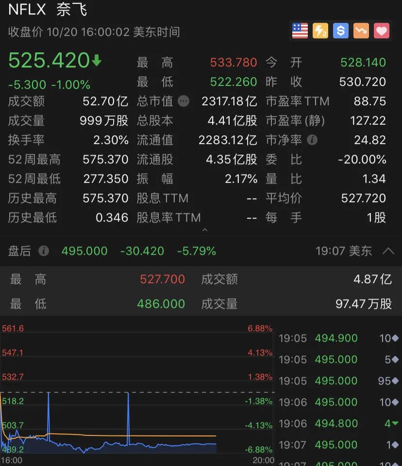 奈飞盘后发布季报,第三季度每股收益1.74美元,市场预估2.13美元;第三季度营收64.4亿美元,市场预估63.8亿美元。奈飞盘后一度跌近7%。