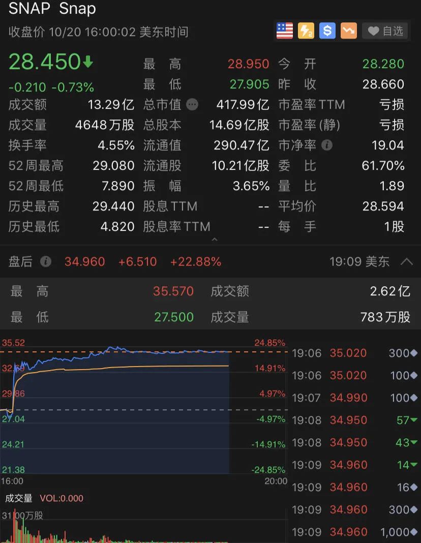 Snap盘后大涨,一度涨近25%。