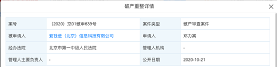 据天眼查显示,10月21日,爱钱进(北京)信息科技有限公司新增一条破产重整信息,申请人为邓力宾,经办法院为北京市第一中级人民法院,案号为(2020)京01破申639号。