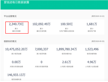 从爱钱进的官网上来看,截止到目前,爱钱进平台还在运营中,平台官网的数据披露截至时间为2020年10月22日,借款标情况截至时间为2020年9月30日,借贷余额尚有189亿。