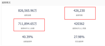 从逾期情况来看,截至2020年9月30日,共有逾期42.6万笔,目前的借贷余额笔数是152.3万笔,项目逾期率为27.98%;逾期金额82.65亿元,披露逾期金额率为40.39%,逾期90天以上的金额71.2亿元。