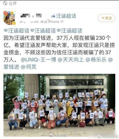 今年7月1日,湖南卫视著名主持人汪涵因所代言的P2P产品疑似“暴雷”而登上微博热搜。有网友在微博发文称汪涵代言的金融理财产品涉嫌诈骗,有37万人被骗了 230 个亿,配图是受骗群众举字幅称“爱钱进诈骗汪涵退代言费,汪涵请出来还我血汗钱”。同时也有很多受骗的网友在各个平台都表示当时都是看了汪涵的广告,相信汪涵才把钱放在涉事理财产品中,强调汪涵需要为此事负责。