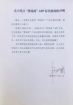 汪涵之后,另一位代言人刘国梁7月5日在接受搜狐体育的采访时表示,自己与“爱钱进”平台的代言始于2018年5月,结束于2019年底。在双方合作前,对方曾经出示过其开展合法经营活动的相关证明材料。