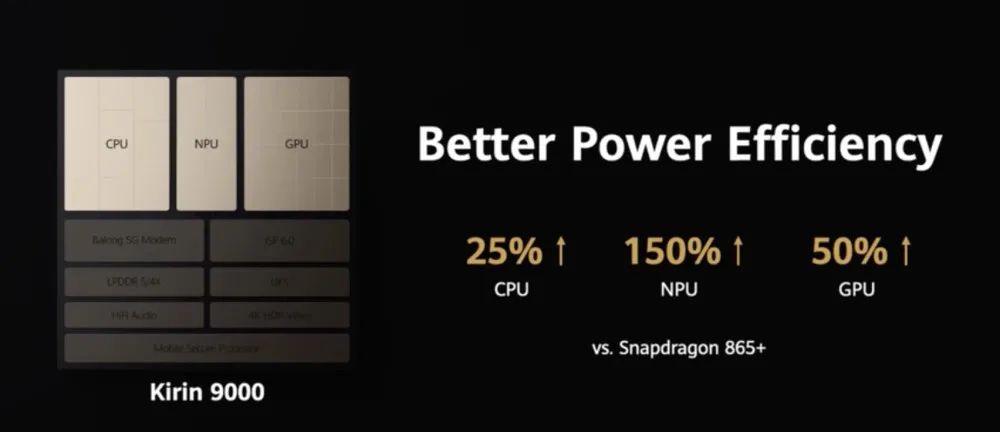 GPU方面,这颗麒麟9000配备的是全新的额ARM Mali-G78 MP24,这是全球首个拥有24核心的移动图形处理器,相对于骁龙865+,性能提升52%。整体的能耗比也比骁龙865+有最低25%的提升。