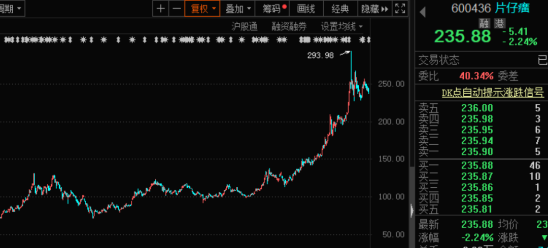 片仔癀是A股知名价值投资标杆,上市以来累计涨幅接近96倍,近十年涨幅超过18倍。今年以来,该股股价也是频频创出历史新高,9月初一度攀升至290元上方,近期该股股价有所回调,最新价位235.88元。即便如此,今年该股累计涨幅依然近116%。