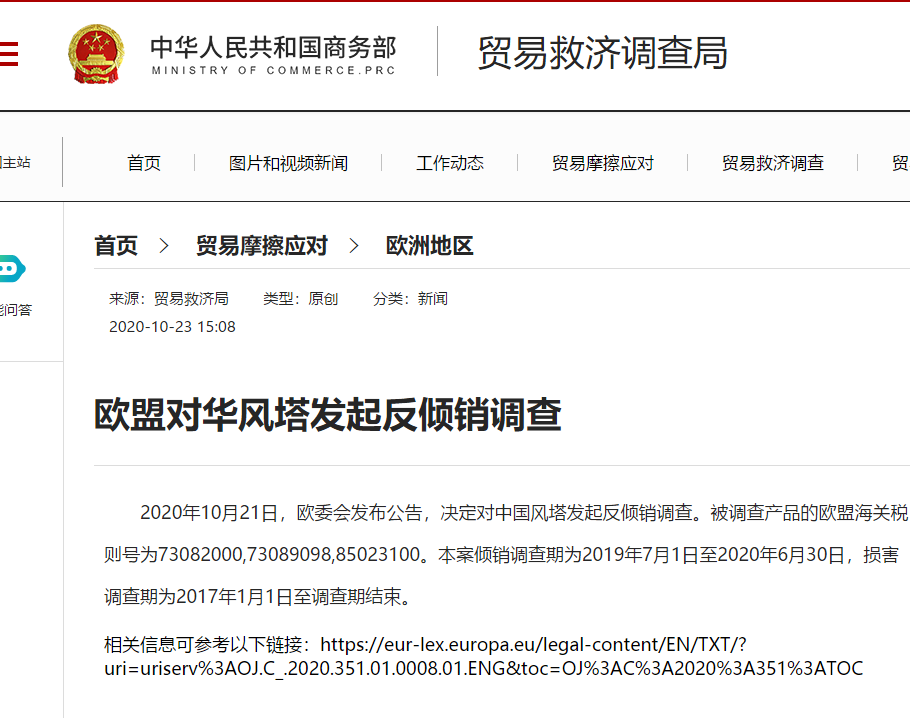 商务部网站信息显示,10月21日,欧委会发布公告,决定对中国风塔发起反倾销调查。被调查产品的欧盟海关税则号为73082000,73089098,85023100。本案倾销调查期为2019年7月1日至2020年6月30日,损害调查期为2017年1月1日至调查期结束。