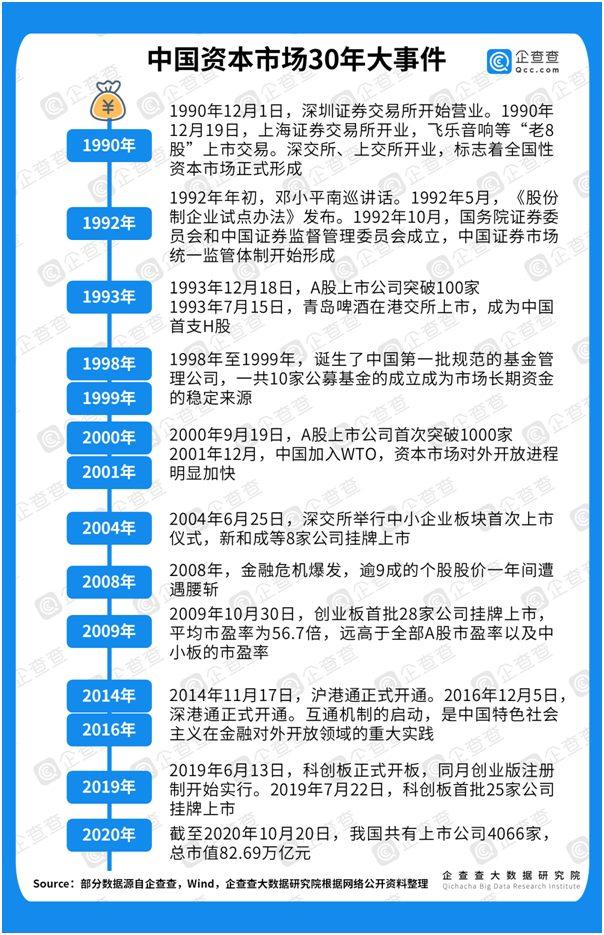 2020年是特殊的一年,诸如新冠疫情、中美关系新局面、特大洪涝灾害等不确定因素,考验着中国资本市场的韧性。不过,如果站在下一个30年后看今朝,当下的中国经济又蕴含着怎样的发展机遇呢?带着这样的疑问,2020年10月,企查查推出《激荡三十年 乘风破浪时——中国资本市场30年大数据报告》,希望从大数据分析的角度,通过“成长与变迁”、“大与强”两对关系,回溯中国资本市场30年来的栉风沐雨。
