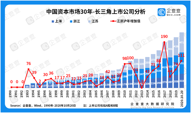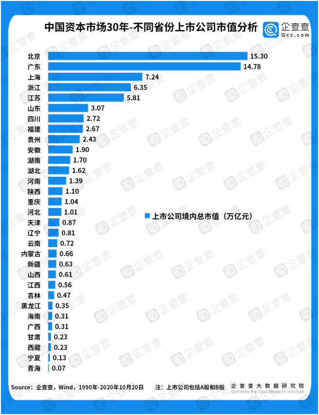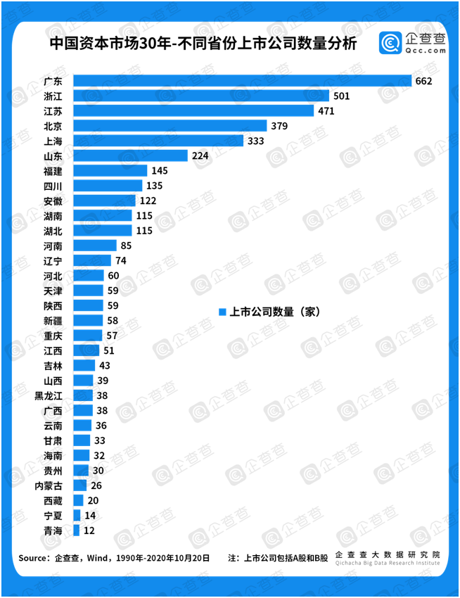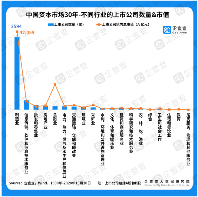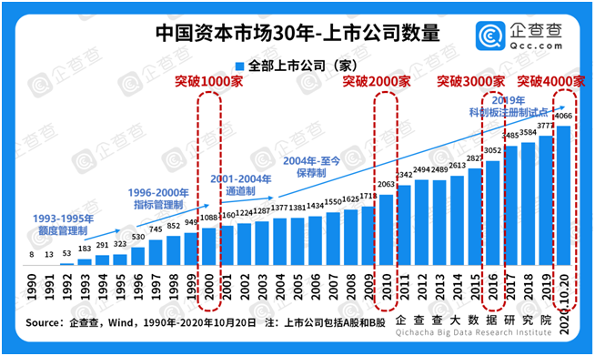 ①上市数量稳增长。谈资本市场,离不开上市公司,二者是鱼与水的关系。企查查数据显示,截至2020年10月20日,我国共有4066家上市公司。从30年来的发展轨迹来看,上市公司数量稳步上升,从1990年的“老八股”,到1996年首次突破500家,2000年总数突破千家,历时十年。2004年至今,随着保荐制的全面实施,上市公司总数于2010年突破2000家,历时十年;于2016年突破3000家,历时六年。上市公司数量的稳定增长,直接反映了中国资本市场的日益繁荣,只有在保证量变的基础上,才有机会谈质变。2019年科创板开市,成为注册制试点;2020年6月,创业板注册制开始施行,标志着我国上市公司在量上将进一步放开,并且终于迎来谈论质变的时机。