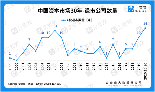 ③退市数量有序中见增长。企查查数据显示,自1999年至今,我国A股退市公司共119家。总体来看,2004-2007年出现退市高峰,约有10余家,其余多数年份在1-3家左右。未来几年或将出现另一个退市高峰,2019年退市公司达到10家,2020年退市公司目前已14家。但是,我国资本市场与全球最大的资本市场美股相比,“吐故纳新”的能力仍有差距,据公开数据显示,1980-2017年,纳斯达克和纽交所的年均退市企业数量为565家,美股累计上市公司数量26505家,累计退市公司数量14163家。